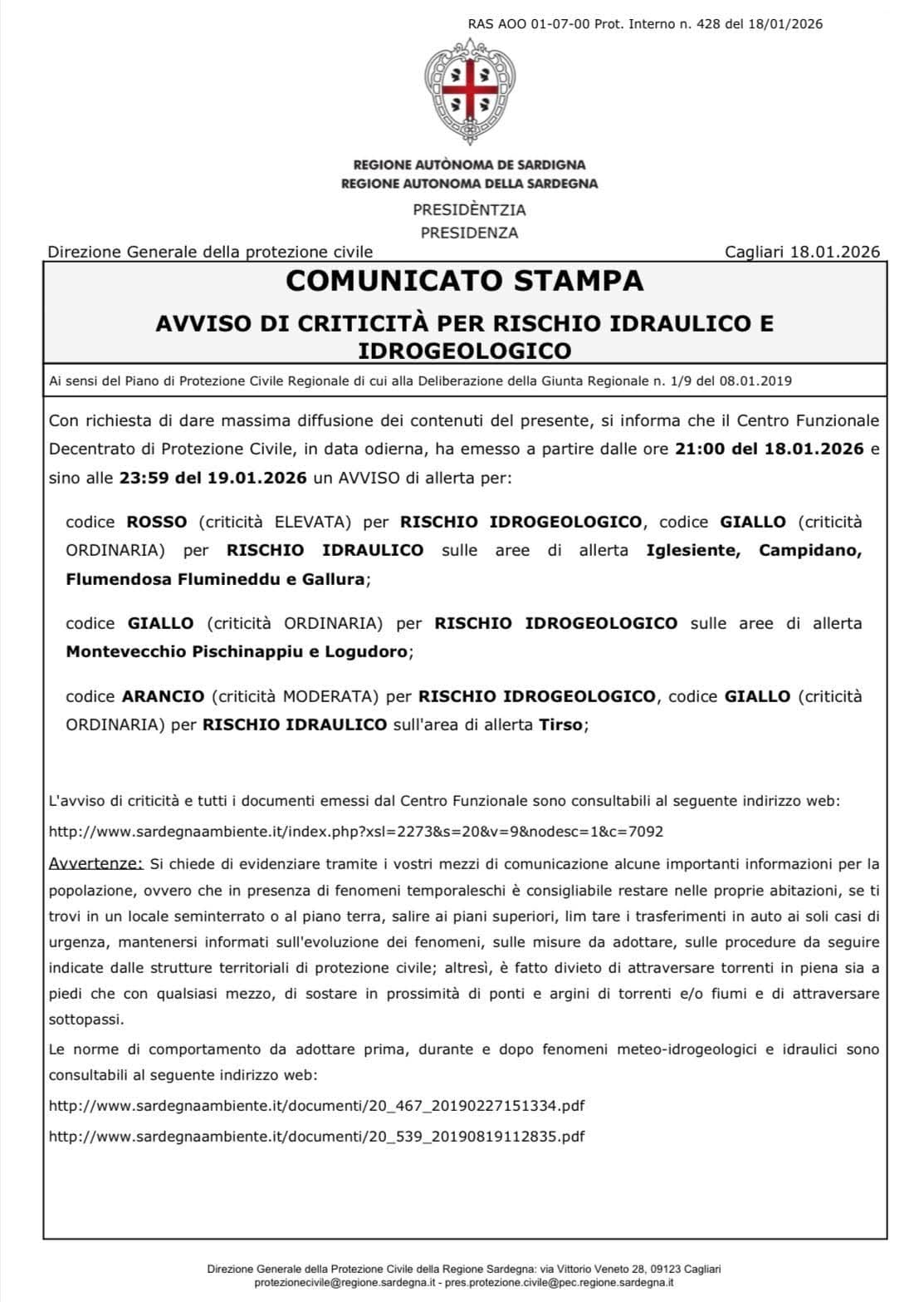 Si avvisa inoltre la popolazione della possibile chiusura della Strada Statale 195 in caso di condizioni di pericolo. Limitate gli spostamenti allo stretto necessario.